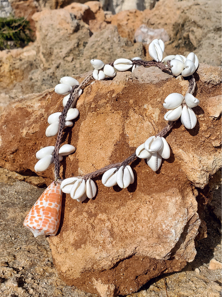 The Tiger cowrie shell is uncut, I only drilled a hole in it and secured it to the necklace with a short crocheted piece.